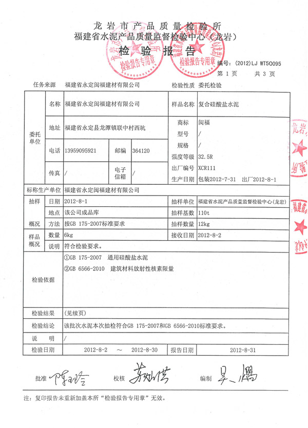 2012年8月31日產(chǎn)品質(zhì)量檢測報告