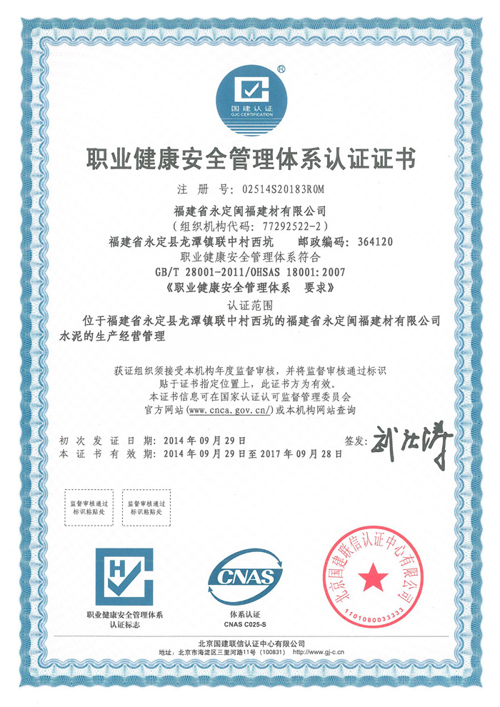 我公司于2014年9月29日通過職業(yè)健康安全管理體系認證