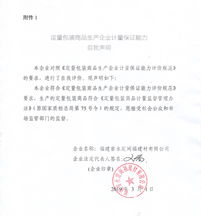 福建省永定閩福建材定量包裝商品生產(chǎn)企業(yè)計量保證能力自我聲明